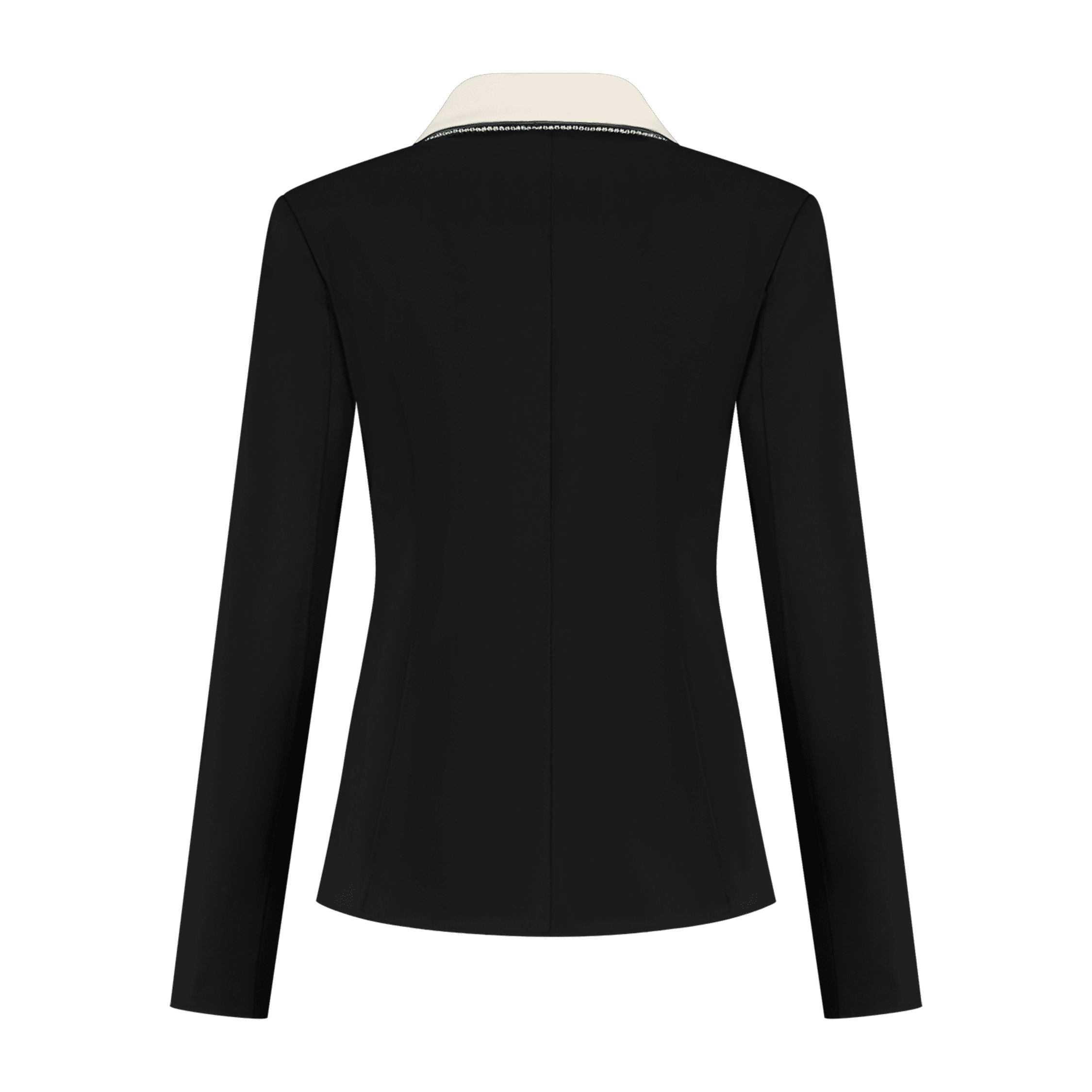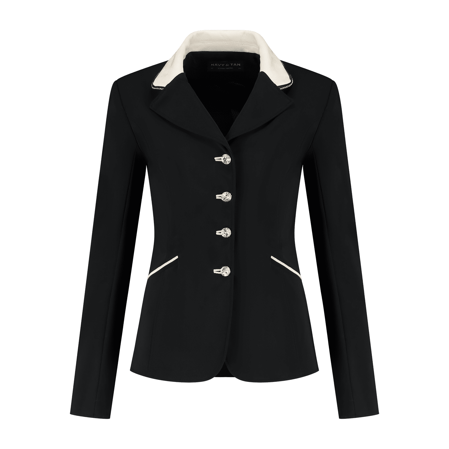 Het Navy & Tan rijjasje in zwart met off-white details is een stijlvolle keuze voor elke ruiter. Gemaakt van een Italiaanse stof van hoge kwaliteit, wat zorgt voor een luxueuze uitstraling. Dit exclusieve jasje is verkrijgbaar in de maten 34 t/m 42, en de levertijd bedraagt 4 weken omdat elk jasje met de hand wordt gemaakt en er slechts een beperkt aantal wordt geproduceerd.